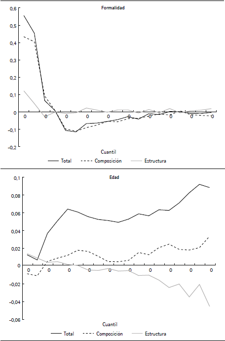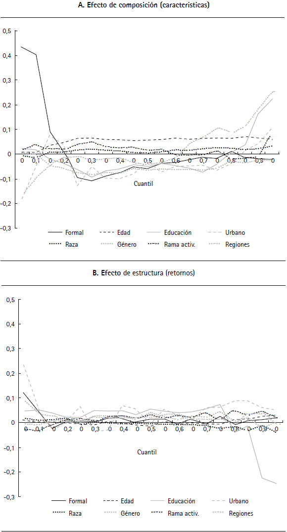 Si bien los primeros resultados sugieren que la mayor parte de la mejora distributiva observada en Brasil se corresponde con un cambio conjunto en la estructura de los retornos asociados a las características de los trabajadores, no son informativos sobre el papel que tuvo cada una de estas características en el efecto agregado. Cada uno de los factores contemplados presenta una evolución diferente durante la década, y cada uno de ellos puede tener efectos dispares en la distribución salarial, que pueden reforzarse entre sí o bien compensarse. En particular, en la sección II se mostró que el mercado de trabajo de Brasil experimentó una mejora distributiva en términos de remuneraciones y, simultáneamente, mejoró la calidad del empleo a partir del proceso de formalización laboral. Esta subsección se centra en las estimaciones del aporte individual de la formalidad y la brecha salarial a ella asociada como factor explicativo de los cambios de la distribución de los salarios. Si bien dicho ejercicio se puede aplicar a cada una de las características consideradas (educación, composición etaria y otras), dado el objetivo del trabajo, el análisis se focalizará en el efecto de la formalidad laboral.
