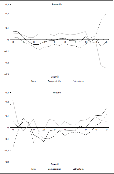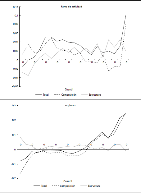 El ejercicio de descomposición agregada muestra que el papel cumplido por el cambio en los perfiles de características observables de los trabajadores fue más importante en la cola superior de la distribución. Si los retornos de cada atributo observable hubiesen permanecido constantes y la evolución de la masa de ingresos solo estuviera explicada por la evolución de esas características, el 80% de los trabajadores con mejores salarios habría visto crecer sus ingresos en un promedio del 22%, frente a un promedio del 5% de mejora en el poder adquisitivo de los primeros cuatro ventiles. Por otro lado, el cambio observado en la cola inferior de la distribución se explica casi en su totalidad por el cambio de la estructura salarial de remuneración a dichas características. Por tanto, este primer ejercicio sugiere que el cambio en los perfiles de las características observables de los trabajadores tuvo un papel desigualador en la distribución del ingreso horario, que fue compensado con creces por el efecto en los retornos.
