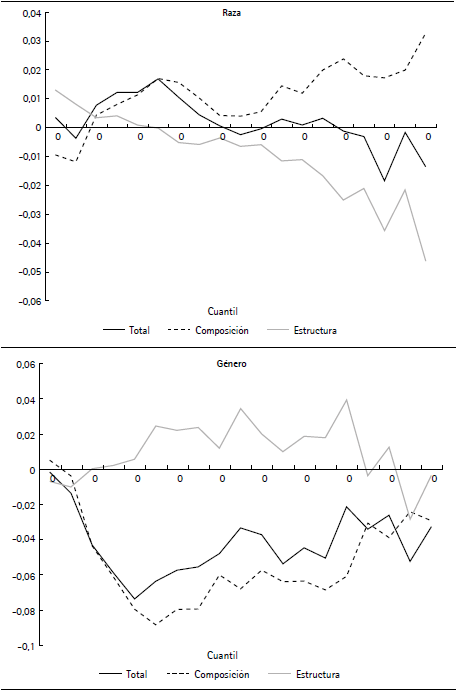 El resto de los atributos observables considerados en el modelo de ingresos presentan efectos parciales más ambiguos sobre la distribución salarial, y en el agregado no muestran efectos estadísticamente significativos. El cambio individual de perfil educativo del Brasil muestra un efecto igualador en el tramo inferior de los salarios, pero muy desigualador en los ingresos laborales superiores. Por tanto, el efecto de composición de la educación mostraría un incremento en el índice de Gini de casi 5,5 puntos. Por otro lado, y en consonancia con otros estudios sobre Brasil en el mismo período, los cambios de los retornos a la educación fueron ampliamente igualadores de los salarios, sobre todo en el tramo de ingresos medios-altos, con un cambio en la distribución salarial que habría mostrado una reducción del índice de Gini de casi 5 puntos en caso de ser la única diferencia entre 1999 y el 2009. La composición geográfica de los asalariados presentó un leve efecto desigualador en el efecto de composición12. El género y los tramos etarios tuvieron efectos parciales significativos en la estructura salarial, pero el impacto en el tramo superior de la distribución fue compensado por el que experimentó el tramo inferior. Finalmente, los cambios sobre la estructura salarial como consecuencia de las modificaciones en los niveles de diferenciales salariales por grupo étnico fueron levemente igualadores a lo largo de toda la distribución. Sin embargo, dicho efecto desaparece en el agregado por un efecto desigualador menor producido por el cambio en la composición de los asalariados de los distintos grupos étnicos de Brasil.