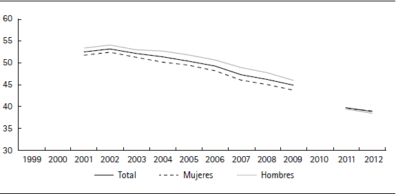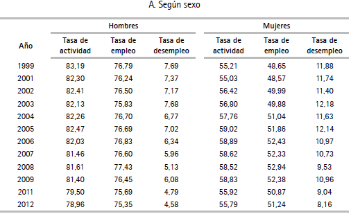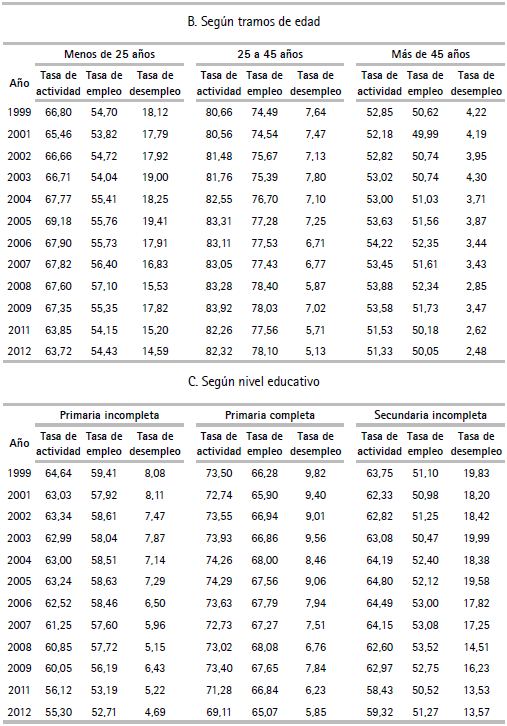 Al distinguir a los trabajadores de acuerdo con sus características (cuadro A.2 del anexo) se encuentra, en primer lugar, que las mujeres fueron quienes mostraron mayores variaciones de las tasas de actividad y de empleo, mientras que los hombres tuvieron mayor caída relativa de la tasa de desempleo. En concreto, si bien la tasa de actividad femenina casi no se modificó si solo se consideran los extremos del período, pasó del 55,2% en 1999 al 59,0% en el 2005 y al 55,8% en el 2012. La tasa de empleo femenino mostró una evolución similar, con la diferencia de que, aun habiendo disminuido después del 2006, el registro de empleo del 2012 fue superior al de 1999. Los hombres, por su parte, evidenciaron una disminución de la tasa de desempleo del 40% durante todo el período.