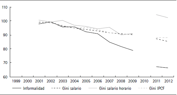 Como sucedió en otros países de América Latina, durante la década del 2000 Brasil evidenció una reversión de la tendencia a la concentración del ingreso que había comenzado a finales de la década de 1980 y se había acentuado durante la década de 1990. En particular, el índice de Gini estimado sobre el ingreso salarial registró una sustancial caída (superior a los 7 puntos) entre 1999 y el 2012. De manera simultánea, durante la década del 2000 se produjeron numerosos cambios en el mercado de trabajo, entre los cuales se destaca la importante baja de la tasa de informalidad1. La tendencia de estos dos indicadores fue relativamente estable durante la década, sin la presencia de altibajos ni vaivenes como los que reflejaron las crisis de países vecinos como Argentina y Uruguay.