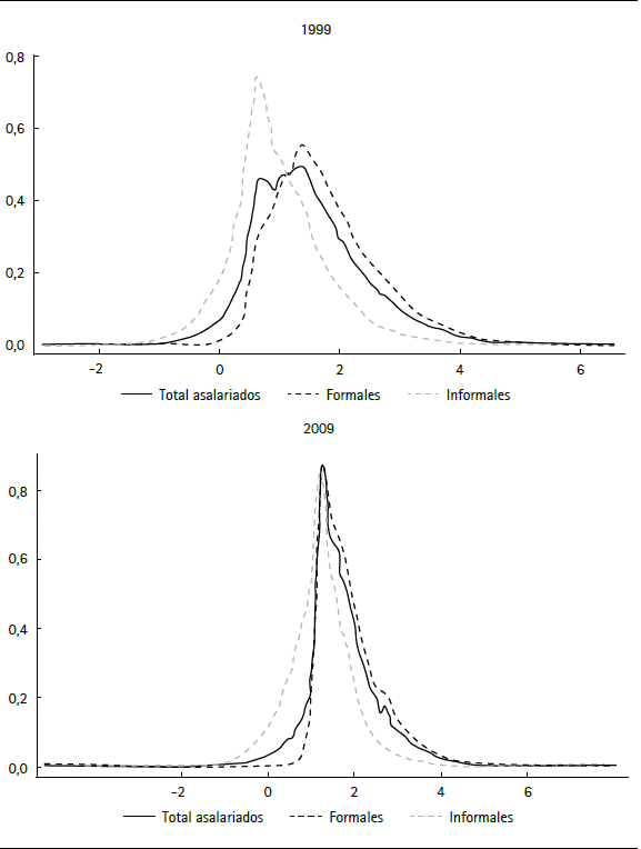 Los estudios recientes sobre el mercado de trabajo en Brasil muestran que los trabajadores informales y por cuenta propia reciben salarios más bajos que aquellos que reciben los trabajadores del sector formal, aun controlando por características individuales. Por tanto, es de esperar que los cambios en la composición de estos grupos generen efectos en los niveles de concentración de los ingresos. Una primera forma de aproximarse al fenómeno de las diferencias salariales es observando las funciones de densidad de Kernel de la distribución en cada uno de los grupos. En concreto, en la figura 4 se presentan las funciones de densidad de Kernel para el logaritmo del ingreso laboral horario en 1999 y el 2009, distinguiendo entre los asalariados formales y los informales.