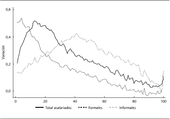 Es interesante analizar brevemente la evolución temporal que han tenido las distribuciones salariales en los distintos grupos de trabajadores. En la figura 5 se observa que, en el conjunto de los asalariados, ha habido un crecimiento del salario real en todos los puntos de la distribución salarial. Sin embargo, dentro del grupo de trabajadores formales, son los de menores ingresos los que más han expandido su poder adquisitivo. Por tanto, el objetivo de la sección IV será establecer el grado de asociación de estas diferencias salariales en los distintos sectores con el cambio del grado de formalidad en el mercado de trabajo del Brasil.