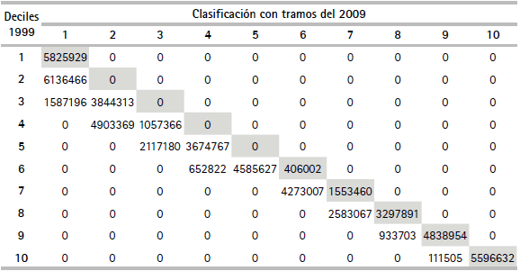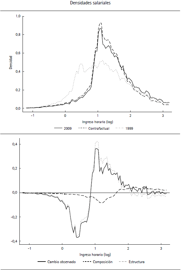 (2)En otras palabras, se trata de la distribución de ingresos laborales que existiría si la estructura salarial del 2009 se observara, pero con individuos que tienen la misma distribución de características que la observada en 1999. El supuesto clave detrás de este ejercicio es que la distribución condicional de salarios no es alterada por modificaciones en la distribución de las características x.