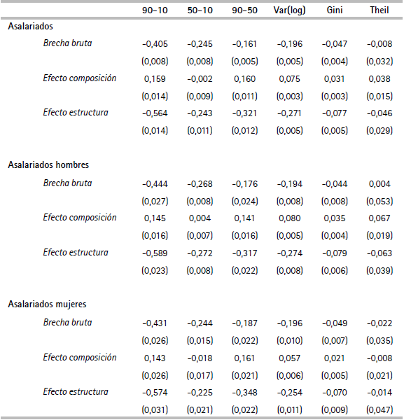Los niveles de desigualdad reflejados en el índice de Theil presentan un patrón similar. Sin embargo, dado que el cambio observado es pequeño, ambos efectos (características y retornos) se ven compensados. Como se destacó previamente, el mismo patrón aparece en la descomposición realizada para cada una de las submuestras consideradas: tanto en los asalariados hombres como en las mujeres, la caída en la desigualdad observada durante la década del 2000 se vio impulsada principalmente por un cambio en el efecto de la estructura salarial que compensó con creces el efecto desigualador del cambio de las características, reduciendo, en particular, la brecha salarial en la parte alta de la distribución.