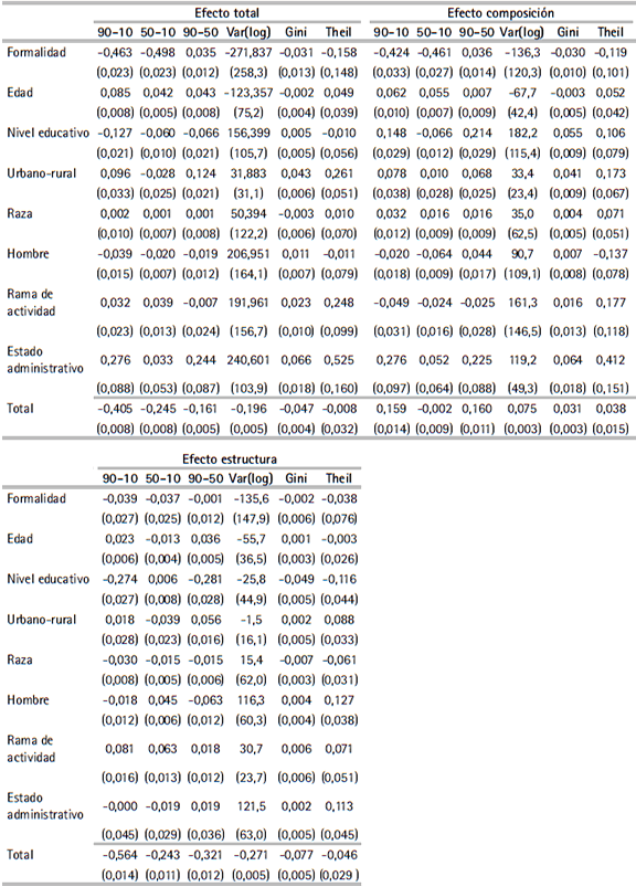 El objetivo de este estudio es vincular cuantitativamente los cambios de la distribución de los ingresos salariales con la evolución observada de distintas variables del mercado laboral brasileño. Aunque la meta primordial del trabajo es dilucidar la contribución del proceso de formalización experimentado durante toda la década, esta se debe analizar junto con otros factores relacionados. Para realizar este análisis conjunto y poder establecer la contribución de cada factor, se presenta una serie de ejercicios de descomposiciones econométricas a partir de microdatos. Si bien este tipo de metodologías se basa en un enfoque de equilibrio parcial, permiten una caracterización del cambio distributivo en dos momentos del tiempo en función de los cambios de distintos factores y características. Los ejercicios de descomposición considerados se basan en la combinación de técnicas de reponderación junto con estimaciones de modelos de función de influencia recentrada (RIF). La ventaja de estos métodos reside en que ofrecen una alternativa flexible a los modelos paramétricos de salarios en los que se basan las descomposiciones realizadas con otras metodologías, como las de Oaxaca-Blinder (Firpo et al., 2011).