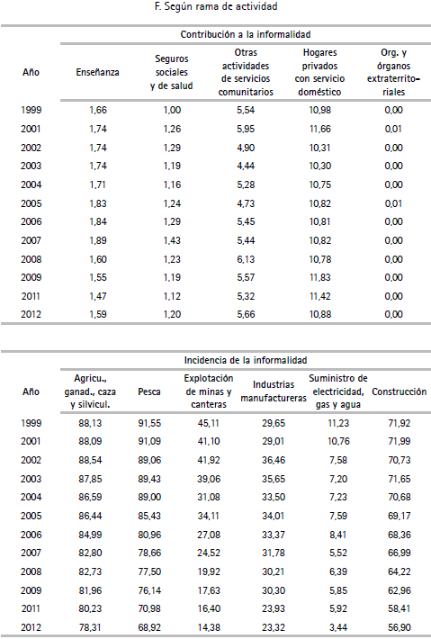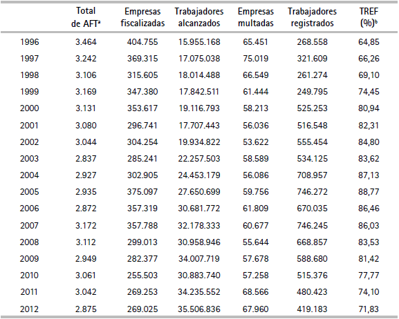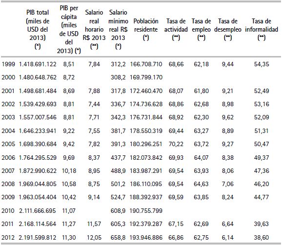 Entre 1999 y el 2012, el PIB a precios constantes de Brasil creció a una tasa media anual de aproximadamente un 3,4%, resultado de una combinación de años de retracción y crecimiento. Los cambios en la economía ocurrieron simultáneamente con cambios en el mercado de trabajo. La tasa de desempleo cayó más de 3 puntos porcentuales, ubicándose en el 2012 en un 6,1%. Por su parte, la tasa de empleo aumentó 2,5 puntos porcentuales entre 1999 y el 2008, retrayéndose en los años siguientes, hasta ubicarse en el 2012 en valores muy cercanos a los de fines de la década de 1990. Asimismo, la tasa de actividad, es decir, la cantidad de ocupados y desocupados en relación con la cantidad de personas en edad de trabajar, registró su valor máximo en el 2005 (70,2%) y disminuyó en los años siguientes, siendo en el 2012 (66,9%) casi 2 puntos porcentuales inferior a la de 1999 (68,7%) (cuadro 1). En el anexo se resume información referente a la evolución de distintos indicadores del mercado de trabajo.