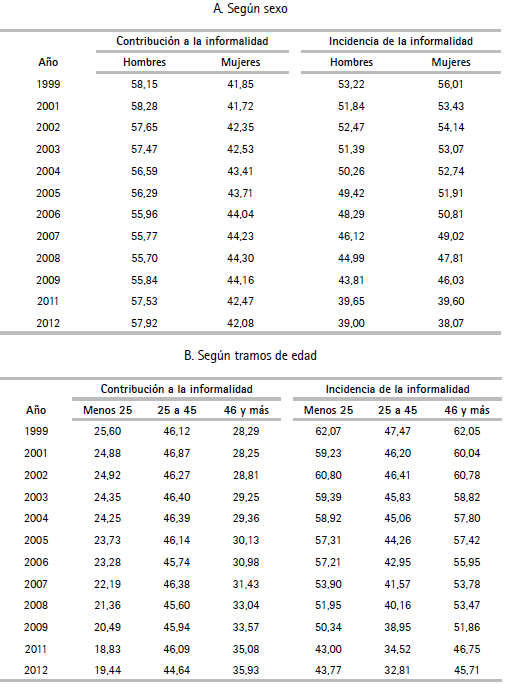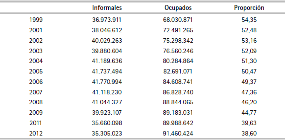 La significativa caída de los niveles de desigualdad de ingresos registrada en Brasil durante los primeros años de la década del 2000 ha sido documentada y discutida por distintos autores. Trabajos como los de Barros et al. (2010), Ferreira, Firpo y Messina (2014), Lustig y Gasparini (2011), Lustig, López-Calva y Ortiz-Juárez (2012) y Maurizio (2014), entre otros, analizan los factores determinantes de la reducción de la concentración del ingreso y dan cuenta de un descenso de la desigualdad, tanto de los ingresos laborales como de los no laborales. En este artículo se presenta el estudio de la relación entre la evolución de la desigualdad y la de la informalidad laboral durante la década del 2000 en Brasil. A lo largo del período comprendido entre 1999 y 2012, la economía brasileña mostró un importante crecimiento que estuvo acompañado de cambios en la injerencia del Estado en el mercado de trabajo y en la implementación de nuevas políticas sociales de amplia cobertura. Este proceso de crecimiento económico se tradujo en una mejora del bienestar de los hogares, como se refleja en el crecimiento del salario real medio, en un importante descenso del desempleo y en una caída de casi 16 puntos porcentuales de la tasa de informalidad laboral, que pasó de un 54,4% a un 38,6%. Aunque existe amplia evidencia empírica sobre las diferencias salariales entre trabajadores formales e informales, un cambio tan importante en el tamaño relativo de estos grupos indica que al estudiar sus consecuencias en la distribución de los ingresos deben tomarse en cuenta tanto los efectos de composición como los de retorno a las características individuales de los trabajadores.