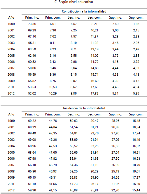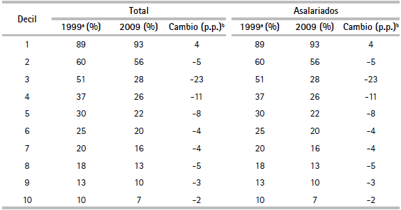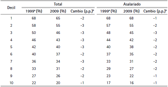 Elaboración propia sobre la base de Instituto Brasileiro de Geografia e Estatística (IBGE), encuestas nacionales de hogares (PNAD, 2015).Por último, si consideramos la evolución de la tasa de informalidad por deciles del salario (cuadro A.4 en el anexo), observamos un aumento en el primer decil y una fuerte reducción en los deciles 3 y 4. Esto pareciera sugerir que el proceso de formalización no fue homogéneo en los distintos puntos de la distribución salarial. Sin embargo, se debe ser cuidadoso con esta lectura puesto que este análisis no es condicional en otras variables que afectan la formalidad del empleo. Es decir, existen otros factores relacionados con la formalidad del empleo (edad, educación, sector de actividad, etc.). Si comparamos la probabilidad de ser informal de los trabajadores en el 2009 con la predicción de esos mismos trabajadores pero con los parámetros de un modelo Probit estimado en 1999 (cuadro A.5 en el anexo), se observa que una vez controlado por el efecto del resto de las variables, la reducción en la informalidad se vuelve homogénea para cada uno de los deciles del salario. Además, y como veremos en la siguiente sección, si consideramos que existieron reordenamientos entre la distribución de ingresos laborales de 1999 y la del 2012, esto relativiza aún más la comparación directa de las tasas de informalidad por grupos de deciles salariales.