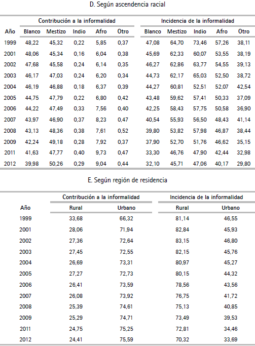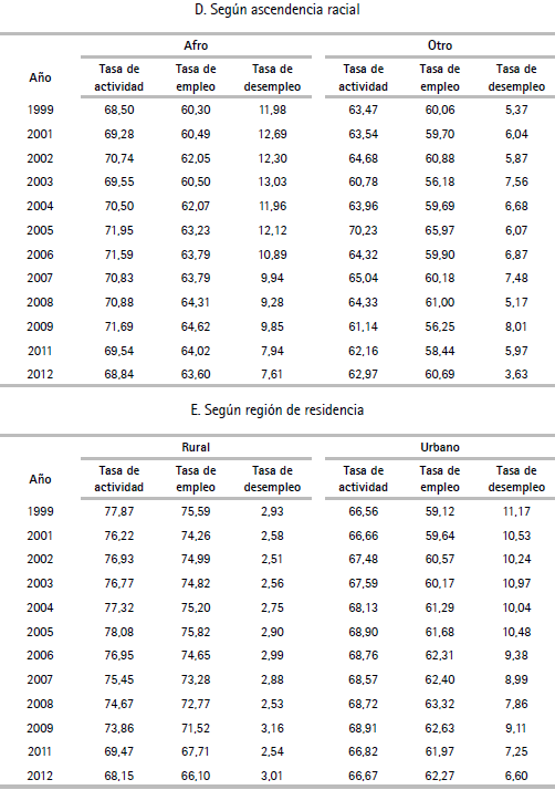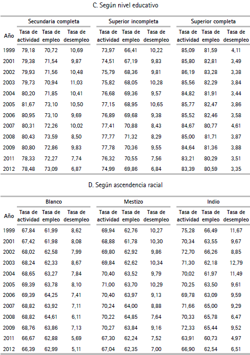 En cuanto a las diferencias por la ascendencia racial, los afrodescendientes fueron los únicos que registraron una variación positiva de la tasa de actividad y de empleo al mismo tiempo, mientras que los blancos mostraron el mayor aumento relativo de la tasa de empleo. Los indígenas, por otra parte, evidenciaron la caída más pronunciada de la tasa de desempleo en el período.