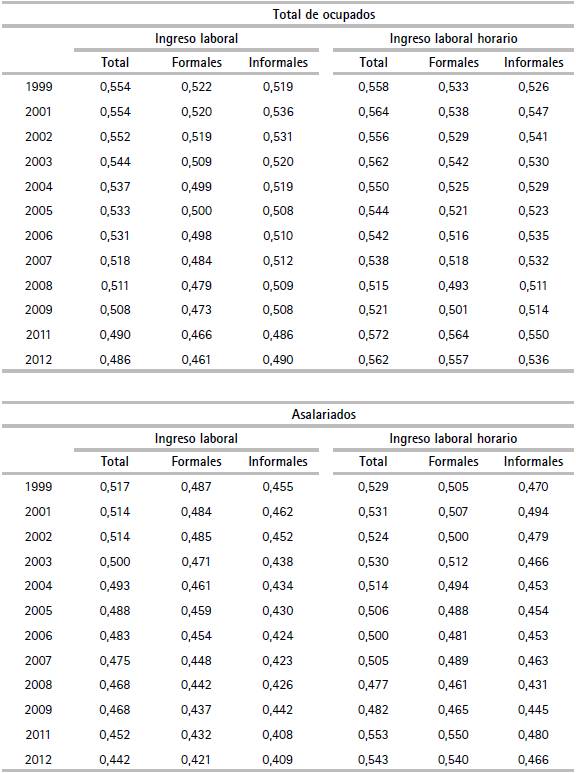 Durante el período comprendido entre 1999 y el 2012, se produjo en Brasil una importante caída de la desigualdad que ubicó a ese país entre los que lograron la mayor disminución de los niveles de concentración de ingresos de la región. Estos cambios ocurrieron en un contexto de crecimiento de la economía y de importantes modificaciones en el mercado laboral. La reducción de la desigualdad de ingresos salariales tuvo lugar junto con una elevada formalización laboral, que fue en gran parte impulsada por distintas medidas de política a favor de una mayor protección de los trabajadores. Con el fin de estudiar el efecto que pudo haber tenido el proceso de formalización brasileño sobre los niveles de concentración del ingreso, en este artículo se realizó un estudio mediante técnicas de descomposición econométricas, empleando microdatos de las encuestas de hogares y personas.