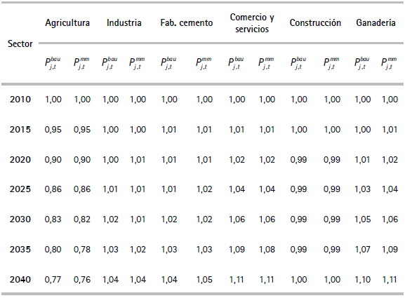 A partir de la matriz de contabilidad social del año 2010 (véase anexo 4) se construye el escenario base (BAU [business as usual]). En él no hay implementación del compromiso de reducción de emisiones y se utiliza como un punto de comparación para evaluar el efecto de la implementación de las medidas de mitigación de emisiones de GEI. Este escenario no es una proyección o pronóstico de la economía, sino una referencia al crecimiento potencial de la economía, que debe ser consistente con tres balances macroeconómicos: el déficit del Gobierno (ahorro público), la cuenta corriente (ahorro externo) y el balance ahorro-inversión.