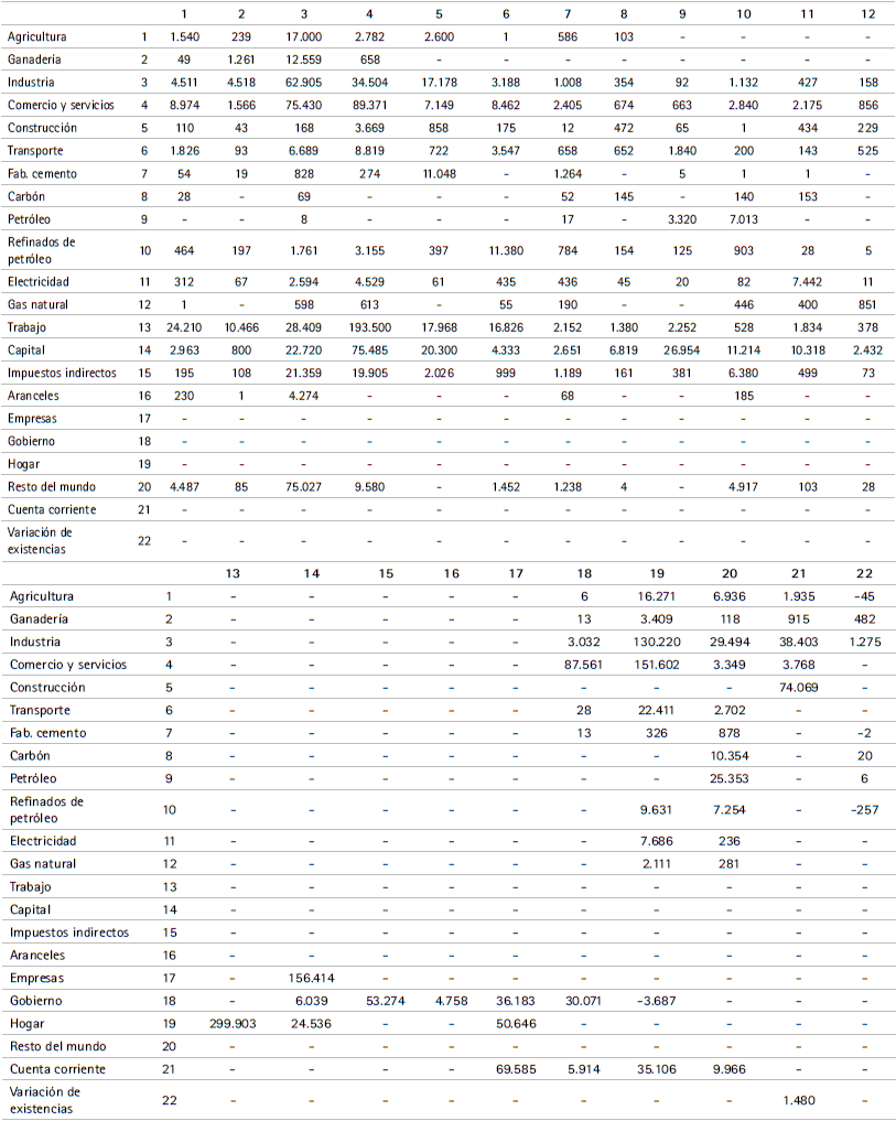 La matriz de contabilidad social, insumo cuantitativo del modelo, tiene como año base el 2010 y está agregada en doce sectores económicos. Entre ellos se encuentran los energéticos (carbón mineral, petróleo, refinados de petróleo, electricidad y gas natural). La incorporación de los bienes energéticos fue posible gracias a la información de la matriz oferta-utilización de la cuenta ambiental y económica de energía y de emisiones del DANE, que hace parte del Sistema de Cuentas Satélites Ambientales.