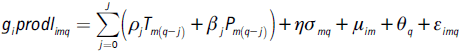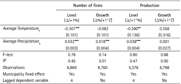 (12)The difference between regression (11) and (12) is the dependent variable. In the first regression, it is the level of output per worker and in the second it is the growth rate. For both regressions μim is the industry-municipality fixed effect, θq is the time fixed effect, σmq is the temperature variance, Pm(q-j) is the precipitation and Tm(q-j) is the temperature (all variables in equation (11) are in logarithms). The parameter of interest is, therefore, ρj, which accompanies the temperature indicator. Since the survey is a panel, the regression is run where i is the industry, m the municipality and q is the quarter. The industry municipality fixed effect is very important because it captures all the statical differences in levels of production between industries and municipalities. Finally, the time fixed effect captures all changes in average output per worker that vary smoothly over time for all industries and municipalities equally. To calculate J, the Durbin's h-test is performed to check for serial correlation. The lags are included as long as they are statistically significant. For L, the literature states that only one lag is necessary.