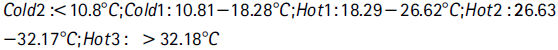 Cold2 :< 10.8°C;Cold1: 10.81−18.28°C;Hot1: 18.29 − 26.62°C;Hot2 : 26.63 − 32.17°C );Hot3 :> 32.18°C