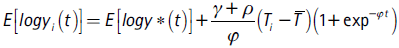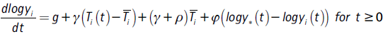 (3)Equation (3) shows that the changes in output per worker, with respect to a change in average temperature, depends on the convergence parameter (φ), the effect of temperature in the short-term (γ) and the degree of adaptation to average temperatures in the long-term (ρ).