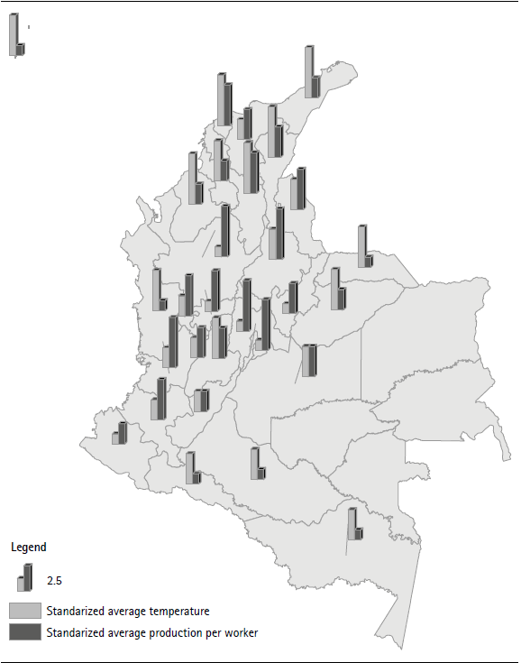 There is evidence that suggests a correlation between temperature and income in Colombia. This evidence is shown in Figure 1. In the map, one bar is worker output and the other is temperature. Most departments have one big bar together with a small one. Figure 2 illustrates a positive correlation between the competitiveness ranking5 and temperature (Sánchez & Acosta, 2001). This means that the departments that are ranked within the top five in Colombia (including Bogotá D. C., Valle, Antioquia) tend to have lower temperatures compared to Chocó, Córdoba and Sucre that are ranked last. Even if these are only correlations that do not represent causality, they suggest a strong effect.