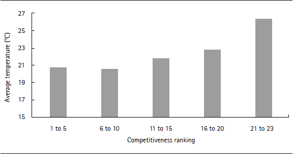 Note: Departments are the unit of analysis in this graph. The bar labelled “1 to 5”’, represents the average annual temperature in the top-five ranked departments in 2001. The departments with the lowest competitiveness ranking are Chóco, Córdoba and Sucre, the highest are Bogotá, Valle and Antioquia.