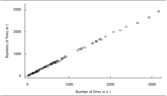 The main assumption of this methodology is that the market share remains constant within a year (the variation across years is low so the assumption is reasonable). This is the main reason why the number of firms is used to calculate the market share. It is possible that production varies considerably within a year across municipalities; however, the number of companies in each industry is relatively structural and remains largely constant throughout quarters.