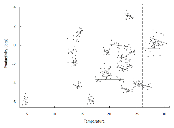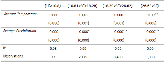 In this paper, we develop one additional strategy to provide some evidence of the non-linear effects. The approach is to break the sample into the temperature categories identified in the lab experiments, expecting larger negative effects in the groups that have the highest average temperatures.