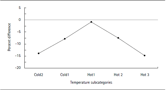 Ergonomic studies state that the effect of temperature on productivity is nonlinear because in high-temperature places the effect is greater: "If the economic response to temperature is non-linear in agreement with ergonomic studies, temperature changes during the hottest season should have a greater economic impact than temperature changes in other seasons" (Pilcher et al., 2002). Figure 5 illustrates the mean percentage difference in performance between the neutral temperature groups and five temperature subcategories defined by the author.