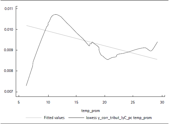 The results of this subsection support the previously reported results. As shown in Figure 6, the results that come from this data are in line with the general empirical results. Both linear and non-parametric estimations show a negative correlation between the tributary income of industry and commerce and the mean temperature. Additionally, the non-parametric estimation illustrates a non-linear effect that is in line with the lab results from Pilcher et al. (2002).
