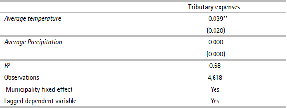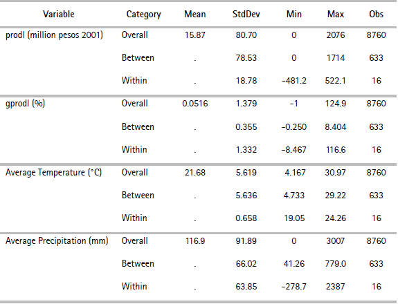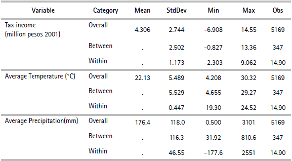 Using municipal level data for Colombia, this section shows the relationship between Geo coded climate variables (obtained from Worldclim (Hijmans, Cameron, Parra, Jones & Jarvis, 2005)) (mean temperature, mean precipitation levels and other climatic variables) and income. Since there is no data for income on a municipal level in Colombia, the independent variable is the proxy tributary income of industry and commerce. This makes sense since the taxes that firms have to pay are linearly related to the value added they produce. In turn, these variables are divided by the total workforce of the municipality to obtain the per-worker level, and the logarithm is then calculated in order to make the regression in levels. The summary statistics can be found in Table 4. The average temperature is similar to the one measured with the weather station data. In the case of precipitation, the calculations are substantially different. In both cases, the within variability is enough to allow for the application of the fixed effects methodology. The mean tax income per worker is four million pesos for all industrial establishments.
