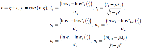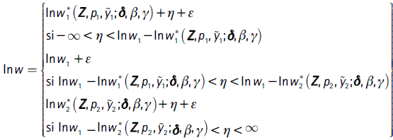 es el ingreso virtual o el ingreso mensual del hogar ajustado por la diferencia de Nordin (Nordin, 1976). El término de error η denota la heterogeneidad de los consumidores, mientras que ε representa el error de optimización equivalente a la diferencia entre el consumo observado y el consumo óptimo, y que en estudios de demanda de agua podría explicarse por la existencia de fugas en los sistemas de provisión del agua. Los términos de error se asumen como independientes con media 0 y varianza σ2η y σ2ε, respectivamente. Los parámetros a estimar son {δ, β, γ} (Burtless y Hausman, 1978; Moffitt, 1990; Olmstead et al., 2007).