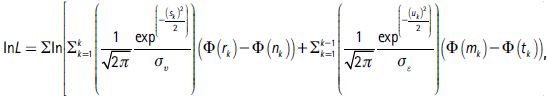 (2)Los parámetros de la ecuación (1) se estiman al maximizar el logaritmo de la función de verosimilitud representada por la ecuación (3), en la cual, la primera sumatoria, corresponde al consumo en los K segmentos lineales de la restricción presupuestaria y la segunda al consumo en K-1 kink points; Φ(.) representa la función de distribución acumulada de una variable normal estándar.