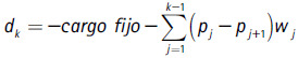 (4)donde wj es el límite superior del bloque de consumo o kink point y pjy pj+1 denotan los precios marginales en el j-ésimo y j+1-ésimo bloque de consumo, respectivamente. El cargo fijo podría considerarse como el costo de conexión al servicio de provisión de agua y no se incluye como argumento en la función de demanda. El valor de dk puede ser positivo o negativo y depende del cargo fijo, del sistema de tarifas por bloques crecientes o decrecientes y el bloque de consumo observado. Si dk es positiva se considera un subsidio que se agrega al ingreso y si es negativa se considera una suma única que se deduce del ingreso (Hewitt y Hanneman, 1995).