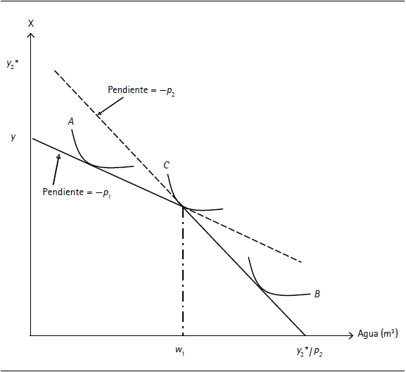 En una estructura de tarifas de agua en BCC la restricción de presupuesto del consumidor está constituida por varios segmentos lineales correspondientes a los k bloques de consumo, su respectivo precio marginal denotado como pk, y k-1 kink points denotado cada uno por wk En la figura 1 se presenta la maximización de la utilidad con curvas de indiferencia hipotéticas y una estructura de tarifas de agua constituida por dos bloques crecientes de consumo, tal como corresponden a Manizales. Donde y es el ingreso y x son todos los otros bienes de consumo distintos al agua (Olmstead et al., 2007). El consumidor tiene tres elecciones factibles de consumo: a) consumir en el segmento uno, b) consumir en el segmento dos, c) consumir en el kink point (w1), que representa el valor de agua consumida de agua que origina un aumento en el precio marginal. El consumo observado de agua dependerá de la forma de la curva de indiferencia con respecto a la restricción de presupuesto, por lo que se presentan tres curvas de indiferencia distintas y se asume que no existen soluciones de esquina al considerar el agua como un bien necesario (Olmstead et al., 2007).