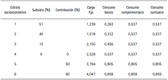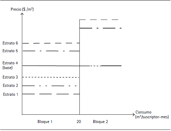 En la figura 2 se presenta la estructura de tarifas del agua vigente en Colombia, considerando los seis estratos socioeconómicos y dos bloques de consumo correspondientes al consumo básico (< 20 m3/suscriptor-mes) y complementario (> 20 m3/suscriptor-mes). La existencia de los subsidios cruzados implica que por un consumo menor que el umbral superior del bloque de consumo básico (20 m3/mes), los suscriptores de los estratos 1, 2 y 3 pagan un precio menor del que pagan los consumidores en el estrato 4. En el bloque de consumo complementario pagan la tarifa del estrato 4. Finalmente, las tarifas de los suscriptores de los estratos 5 y 6 son mayores que la tarifa del estrato 4 para los dos bloques de consumo (véase la figura 2). En el cuadro 1 se presentan los precios por bloque de consumo, así como los porcentajes de subsidio y contribución por estrato socioeconómico para la ciudad de Manizales, correspondientes a valores de diciembre del 2013.