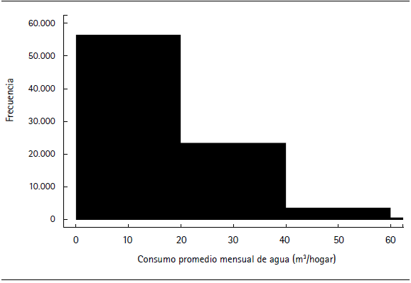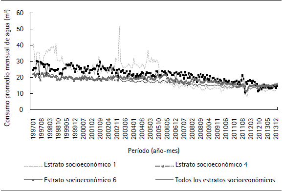La información de consumo mensual de agua y de tarifas para los 490 suscriptores encuestados fue proporcionada por Aguas de Manizales S. A. ESP para el período enero de 1997-diciembre del 2013, equivalente a 204 meses. La información se dio por suscriptor y estrato socioeconómico. Al multiplicar los suscriptores encuestados y el número de meses del período de análisis del estudio se obtuvieron 99.960 registros de consumo. En la figura 3 se presentan los consumos observados para los 490 hogares encuestados, período 1997-2013, de los cuales 80.526 correspondieron a consumos de agua mayores a 0. En el primer bloque de consumo (< 20 m3/ suscriptor-mes) se registraron 50.978 consumos, y 26.938 en el segundo bloque. Es importante mencionar que 2.610 registros de consumo mensual de agua fueron iguales a 20 m3/suscriptor-mes. En el rango de consumo 19-21 m3/suscriptor-mes hubo 7.847 registros de consumo (~10%). En la figura 4 se presenta el consumo histórico de agua para un consumidor representativo en cada estrato socioeconómico para el período 1997-2013.