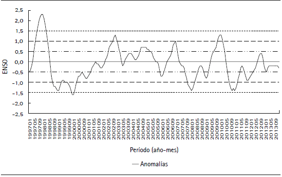 Para identificar las fases del ENSO y su duración se usó el Índice Oceánico El Niño (ONI, por su sigla en inglés), generado por el Centro de Predicción Climática de la Administración Nacional Atmosférica y Oceánica (NOAA, por su sigla en inglés) de Estados Unidos. El ONI se basa en el cálculo de anomalías de temperatura superficial del mar, que corresponden a la desviación de la temperatura observada para un mes específico con respecto a un promedio histórico de 30 años. Un promedio móvil de 3 meses de los valores de anomalías igual o mayor a +0,5 °C por lo menos para 5 períodos consecutivos define un mes El Niño, mientras que un promedio igual o inferior a -0,5 °C define un mes La Niña. El valor del ONI determina la intensidad de cada fase. El Niño (La Niña) es débil cuando el ONI está entre +0,5 y +0,9 °C (-0,9 y -0,5 °C), moderado (a) cuando es >+0,9 °C (<-0,9 °C), y fuerte cuando es >+1,4 °C (<-1,4 °C). En la figura 5 se presentan las fases de ENSO para el período 1997-2013.
