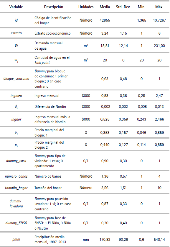La selección de las variables explicadoras de la demanda se realizó a partir de lo reportado por estudios empíricos previos (Arbués et al., 2003; Dalhuisen et al., 2003; Espey et al., 1997; Olmstead et al., 2007; Sebri, 2014; Worthington y Hoffman, 2008) y se presentan en el cuadro 2. La variable diferencia de Nordin (Nordin, 1976) denotada por dk se define como la diferencia entre el costo de consumir una cantidad de agua pagando todas las unidades de consumo al mismo precio marginal y lo que se paga como resultado del sistema de tarifas en bloques de consumo. Para el cálculo de dk para cada hogar se usó la ecuación (4):