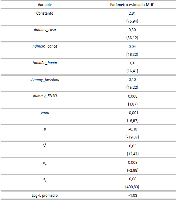 La variable dependiente en el modelo fue el logaritmo del consumo mensual de agua. Las variables explicadoras fueron: dummy_casa, con valor 1 para casa y 0 para apartamento; número_baños, número de baños; tamaño_hogar, número de ocupantes de la vivienda; dummy_lavadora, con valor 1 si posee lavadora y 0 en caso contrario; dummy_ENSO con valor de 1 para mes El Niño y 0 mes La Niña o neutro; pmm, precipitación media mensual (mm); p, precio marginal del agua ($/m3); ingreso virtual mensual expresado en cien miles de pesos ($ 100.000). Finalmente, ση es la desviación estándar del error correspondiente a la heterogeneidad no observada de las preferencias de los consumidores, y σε es la desviación estándar del error de optimización representado por la discrepancia entre consumo óptimo y observado como resultado de la posible existencia de fugas en la red de provisión de agua. Log-L promedio es el valor del logaritmo de la función de verosimilitud dividido por el número de observaciones. Los valores en paréntesis corresponden a valores de t.