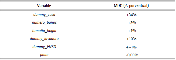 En contraste, para la precipitación media mensual se obtuvo un signo negativo en el coeficiente estimado. Por tanto, la demanda mensual de agua disminuye ~0,03% por un incremento de 1 mm en la precipitación. Finalmente, por el fenómeno de El Niño el consumo mensual se incrementa en aproximadamente un 1% (cuadro 4).