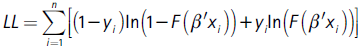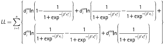 (2)Donde diss, disn, dins, y dinn son variables binarias construidas a partir de las respuestas: sí-sí, sí-no, no-sí y no-no, toman el valor de 1 cuando la respuesta del entrevistado se encuentra en alguna de las alternativas; en caso contrario, el valor es 0. El estimador de máxima verosimilitud se obtiene maximizando la ecuación (2).