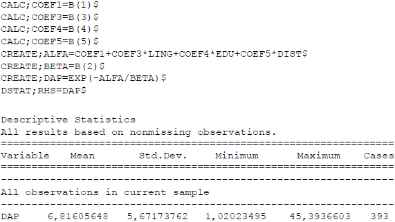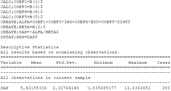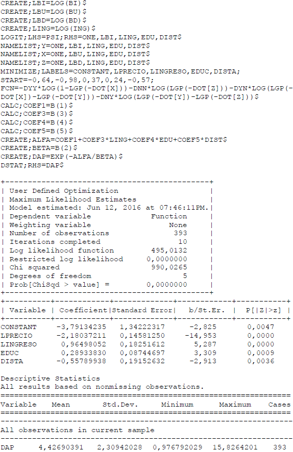 De la misma manera, teniendo en cuenta los resultados econométricos del modelo doble límite que aparece en el cuadro 13, se procede a estimar la mediana para la DAP de cada entrevistado.