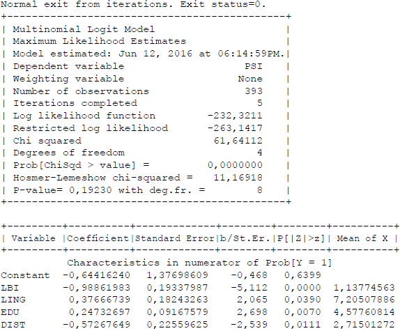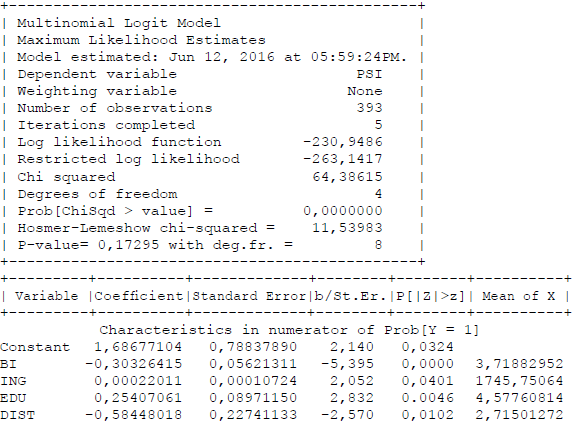 El coeficiente de la variable BI (precio), como se esperaba, es negativo. Esto nos indica que a mayor incremento tarifario o postura ofrecida para que se desarrolle el proyecto, la probabilidad de obtener una respuesta positiva de parte del encuestado es menor. La variable ingreso (ING), por su lado, tiene signo positivo indicando que a mayor nivel de ingreso del entrevistado, la probabilidad de obtener una respuesta positiva es mayor.