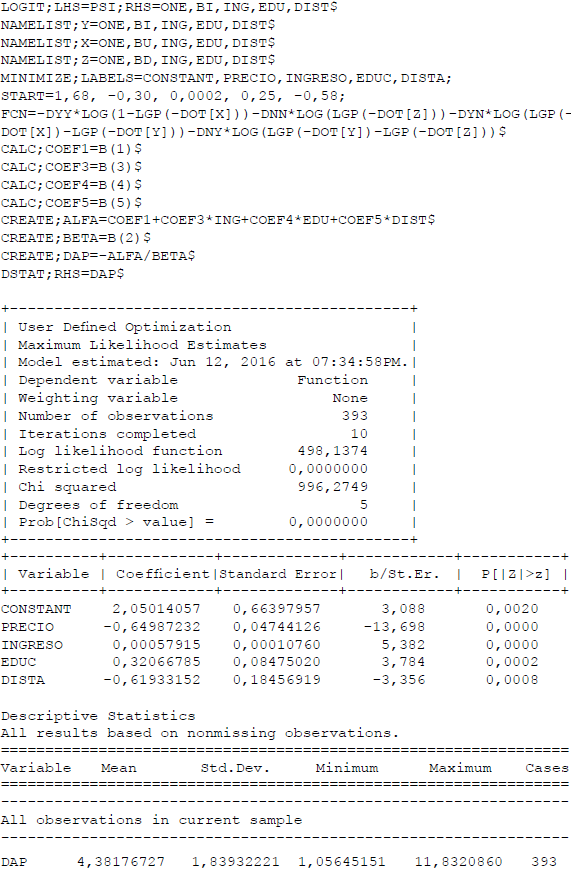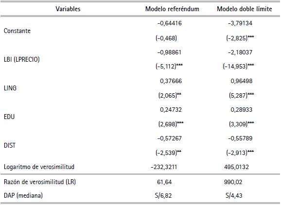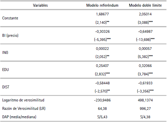 Teniendo en cuenta los modelos estimados, se concluye que los mejores modelos en términos de la significancia individual y el estadístico de la razón de verosimilitud son los modelos que utiliza el formato doble límite; dentro de esta clasificación se tienen dos versiones: lineal y logarítmica (en ambos casos, la forma funcional es para el cambio en utilidad). Entre estas dos versiones se selecciona el modelo doble límite lineal debido a que presenta el mayor valor del estadístico de la razón de verosimilitud.