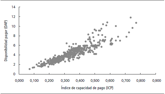 Por otro lado, al relacionar la DAP encontrada para cada grupo de ingreso se observa que el grupo de menor ingreso tiene una DAP menor que el grupo de ingresos altos. En consecuencia, los hogares de menores ingresos al tener una baja capacidad de pago y una baja disposición a pagar serían los potenciales candidatos a recibir un subsidio al modificarse la estructura tarifaria. En la figura 3 se muestra la relación de la DAP y el ICP se confirma que ambas variables están directamente relacionadas.