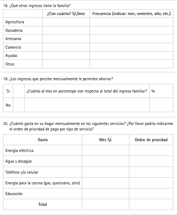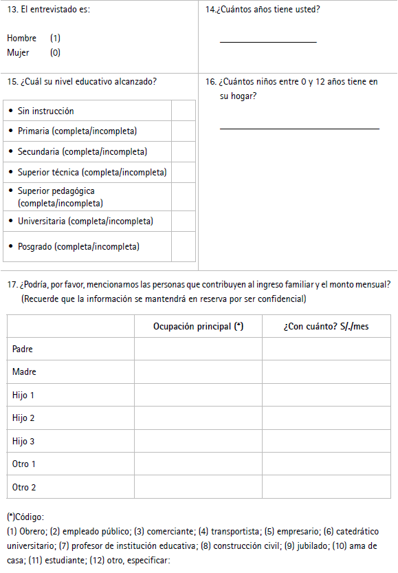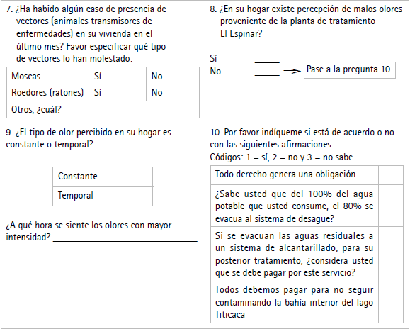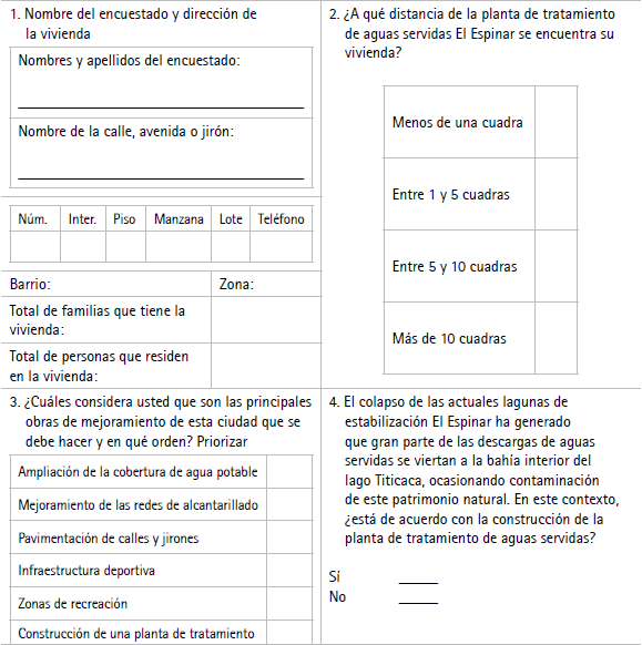 Encuestadores: se administrará el cuestionario solo a personas mayores de 18 años, que sean jefes de familia. Es una entrevista completamente confidencial únicamente utilizada para obtener información socioeconómica de la familia, con el fin de evaluar la capacidad de pago por el mejoramiento del sistema de tratamiento de aguas servidas en la ciudad de Puno.