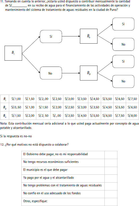 Para la determinación de las posturas, en primer lugar, se hizo una encuesta piloto a aproximadamente 30 jefes de familia seleccionadas al azar con formato de pregunta abierto (este formato se caracteriza porque se hace una pregunta abierta sobre la disponibilidad a pagar). En segundo lugar, se procedió a tabular las respuestas de la DAP (mínimo y máximo). Finalmente, se identificó el valor mínimo en S/0,50 y el valor máximo en S/8,00. Teniendo en cuenta estos valores extremos se ha completado el resto de posturas (en la encuesta piloto no se han detectado respuestas negativas, lo anterior, debido a la creciente conciencia ambiental de la población puneña por recuperar la bahía interior del lago Titicaca).