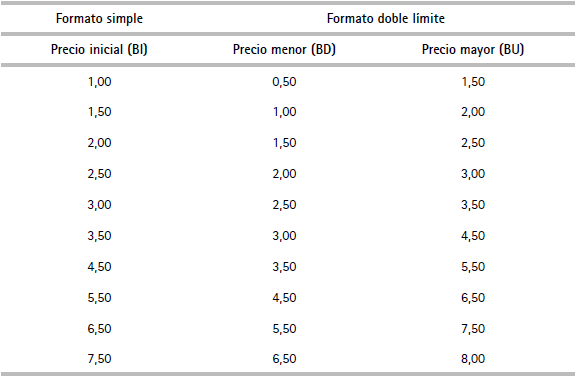 Una vez obtenidas las estimaciones para los parámetros se calcula la medida monetaria de bienestar (DAP), la fórmula para la estimación de la DAP dependerá de la forma funcional del cambio en utilidad (ΔV), que puede ser lineal o logarítmica. El detalle e identificación de variables que permitirá estimar el modelo econométrico logit para el caso referéndum y doble límite se presenta en el anexo 1. En el cuadro 8 se ilustran las posturas ofrecidas en la encuesta para los formatos referéndum y doble límite.