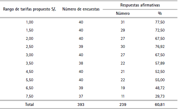 El análisis de la DAP por el mejoramiento del sistema de tratamiento de aguas residuales revela que el 39,19% de los entrevistados no están dispuestos a pagar por este tipo de proyectos, frente a un 60,81% que declararon estar dispuestos a pagar. En el cuadro 9 se ilustran los resultados descriptivos de la DAP; se puede observar que para una tarifa de S/1 el 77,50% de un total de 40 entrevistados respondió afirmativamente, frente a un 29,73% que respondió afirmativamente en el caso de una tarifa de S/7,50.