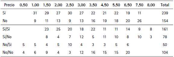 En general, se cumple con lo esperado a priori, es decir, para tarifas menores existen más respuestas positivas, frente a tarifas mayores donde existen más respuestas negativas.