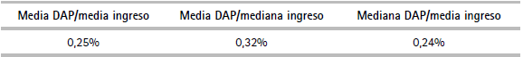 Como se puede apreciar en el cuadro 16, dependiendo del valor de la media o mediana (tanto de la DAP como del ingreso) la relación DAP/Ingreso varía entre 0,24% y 0,32%, lo cual resulta bastante consistente, en la medida que las entidades nacionales e internacionales ligadas al sector saneamiento consideran aceptable que la capacidad de pago para el servicio de agua potable y alcantarillado (incluyendo esta última el tratamiento de aguas residuales) alcanza al 5% y que esta se descompone en el 3% para el servicio de agua potable y el 2% para alcantarillado.