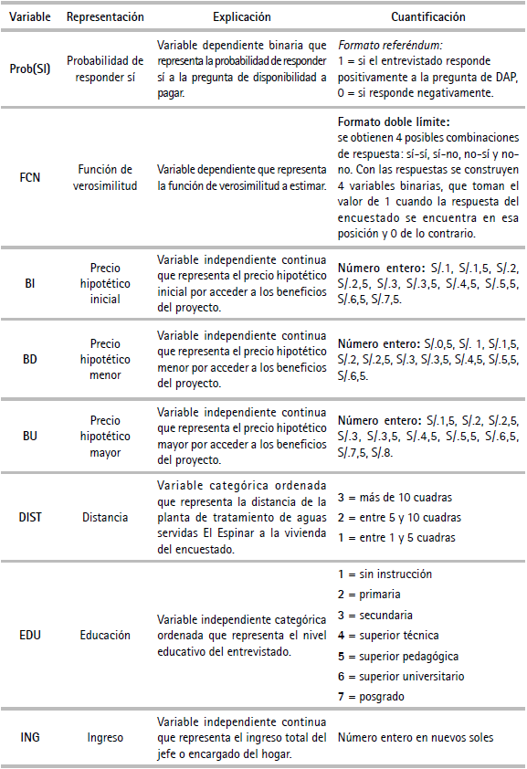 (1)Donde yi es la variable dependiente binaria que toma el valor de 1 si la respuesta a la pregunta de disposición a pagar es sí y 0 de lo contrario. El estimador de máxima verosimilitud se obtiene maximizando la ecuación (1).