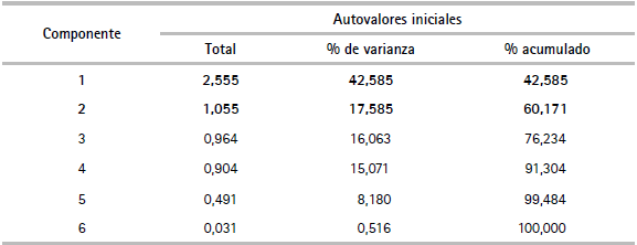 Respecto al test de esfericidad de Bartlett se tiene que el valor para la prueba chi-cuadrado es alto, y el valor del p-value es igual a 0,000, lo que implica que el test es significativo, es decir que las correlaciones entre las variables son distintas de 0 al 1% de significancia. En tanto que la medida de adecuación muestral KMO toma el valor de 0,517, que evidentemente es mayor a 0,5 (cuadro 17). En general, según ambas pruebas, se considera conveniente el uso del ACP ya que para su uso es requisito que las variables estén correlacionadas. Un segundo aspecto del ACP es la determinación de la varianza total explicada, la cual se utiliza para determinar cuántos factores deben retenerse. Los primeros componentes tienen varianzas más altas (autovalores) y recogen el mayor porcentaje posible de la variabilidad de las variables originales.